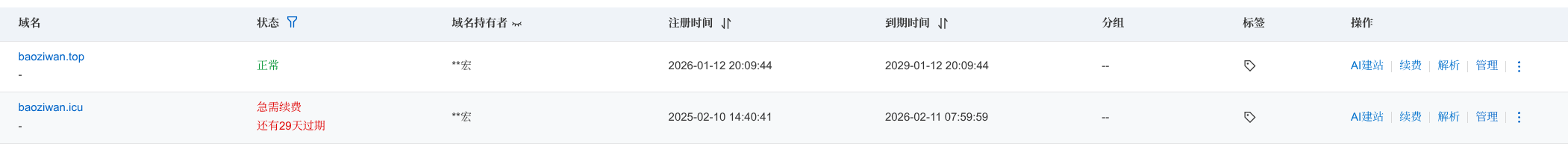 2026年1月12日,用了快一年的baoziwan.icu已经和大家说再见了,由于价格原因,我选择了更换新的域名baoziwan.top,接下来是一些更换过程中的记录